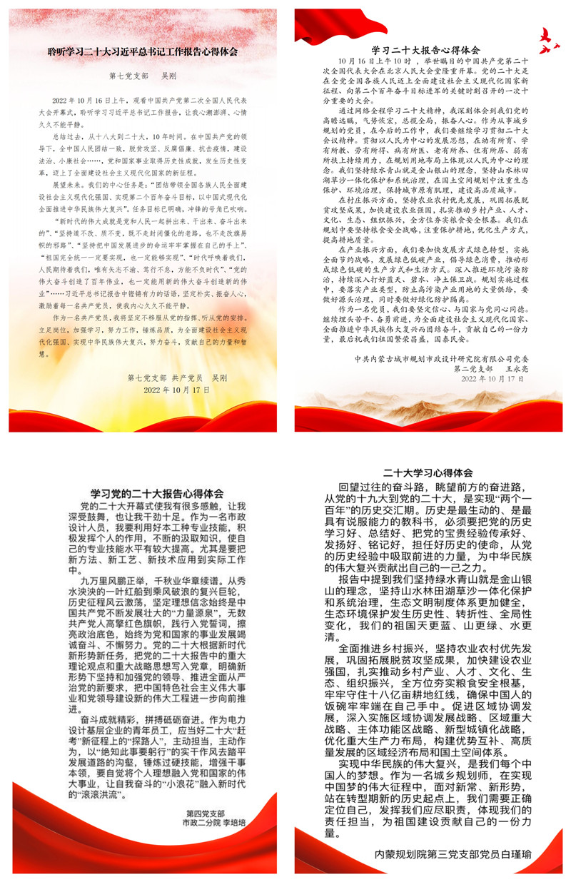 疫情雖然阻擋了大家的腳步,但是阻擋不了各位黨員同志收看的熱情。收聽收看過程中,內(nèi)蒙古規(guī)劃院黨員干部聚精會神地聆聽習近平總書記重要講話,倍受鼓舞、倍感振奮、倍增信心,不時用筆記下報告中的金句。大家紛紛表示,習近平總書記所作的大會報告凝聚人心、催人奮進,尤其是涉及到增進民生福祉,提高人民生活品質(zhì)方面,提出的一系列舉措,讓我們對今后的工作和生活更有盼頭;涉及到推動綠色發(fā)展,促進人與自然和諧共生,推進生態(tài)優(yōu)先、節(jié)約集約、綠色低碳發(fā)展方面,與我們的工作息息相關(guān),作為新時代設(shè)計師,我們要在清潔能源、生態(tài)修復(fù)、低碳建筑等方面大膽創(chuàng)新、銳意進取,為建設(shè)亮麗內(nèi)蒙古貢獻專業(yè)力量。我們將以此為契機,學深悟透習近平總書記重要講話精神,要繼續(xù)堅定不移跟黨走。作為一名黨員技術(shù)人員,要在做好本職工作的同時,不斷加強學習,提升專業(yè)技術(shù)能力和科研水平,為推動全院各項工作再上新臺階貢獻力量。