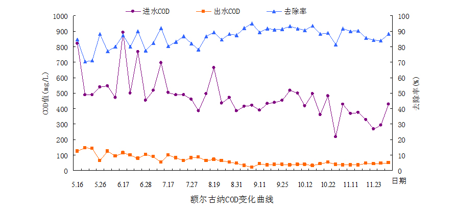 上圖顯示調(diào)試期間COD的變化趨勢以及去除率變化曲線,污泥馴化結(jié)束后15天時間內(nèi),COD去除率可達到70%以上。經(jīng)過近3個月的調(diào)整,自8月中下旬起出水COD值維持在60mg/L以下,平均去除率穩(wěn)定在89%以上并持續(xù)保持良好穩(wěn)定的去除效果。