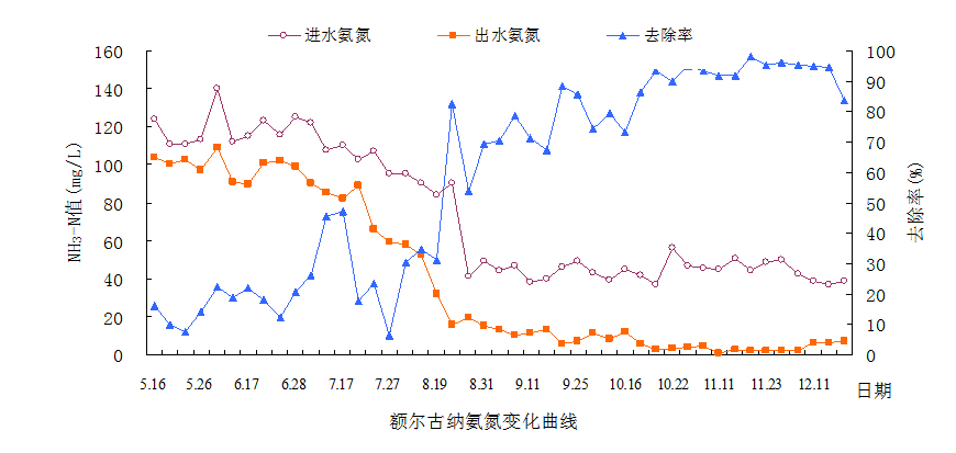 上圖顯示,5月調(diào)試初期由于進水氨氮值較高,系統(tǒng)水溫較低,基本保持在10℃以下,氨氮去除效果并不明顯。7月中旬后,水溫持續(xù)上升,8月下旬基本達到理想處理效果。在9月氣溫開始回降,至10月末降至10℃以下的情況下,系統(tǒng)仍然保持良好穩(wěn)定的去除效果?;揪S持平均出水氨氮值6mg/L,平均去除率穩(wěn)定在87%。這說明,系統(tǒng)的硝化細菌在適宜溫度培養(yǎng)成熟后,在3到5個月內(nèi)能逐漸適應(yīng)低溫。隨著異養(yǎng)菌去除有機物能力的提高和反應(yīng)池生物量的提高,硝化菌逐步得到富集,硝化效果逐步穩(wěn)定。在好氧反應(yīng)階段,反應(yīng)池穩(wěn)定的低負荷、高濃度運行確保良好的硝化效果;在缺氧階段硝態(tài)氮能夠快速利用短時段進水補充的碳源進行反硝化,利用單周期多步進水有效提高反硝化碳源補給率,從而保證脫氮效果。