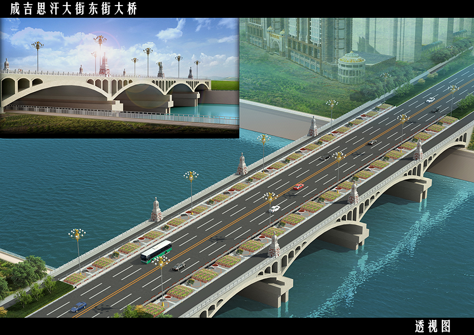 成吉思汗東街東河大橋位于呼和浩特市成吉思汗大街東段,上跨東河,東河河道進(jìn)行了綜合治理,且橋位所在處為東河景觀重點(diǎn)建設(shè)地區(qū)。本工程為舊橋加寬項(xiàng)目,在多種橋型方案中,最終選定外形美觀、大方的拱橋橋型設(shè)計(jì)方案,與舊橋外形保持一致,既增加了橋梁的通行能力,又提升了景觀需求。